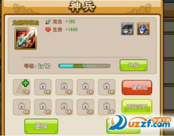 通过武将界面进入,武将信息左上角点开可以穿戴神兵,可随时替换卸下。