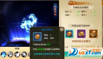 升级法宝有几种可选材料,我们在人物界面就可以看到法宝的详细信息