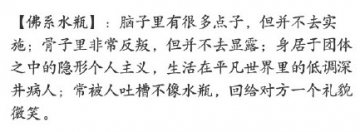 脑子里有很多点子,但并不去实施;骨子里非常反叛,但并不去显露;身居于团体之中的隐形个人主义,生活在平凡世界里的低调深井病人;常被人吐槽不像水瓶,回给对方一个礼貌微笑。