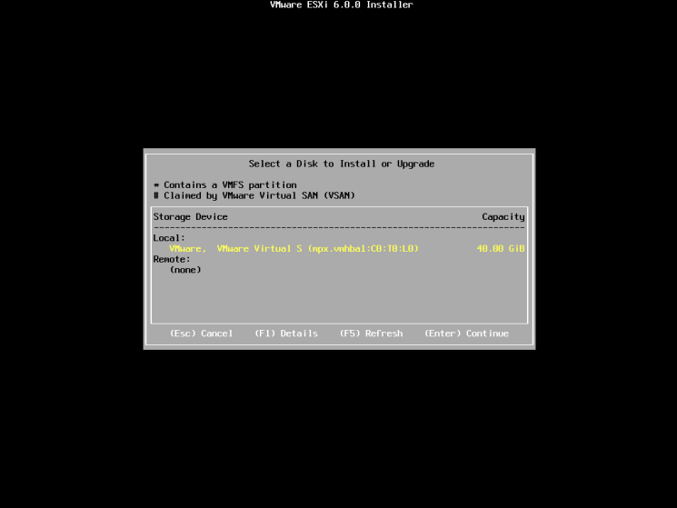4、选择安装位置,ESXI安装器自动检测到本地硬盘,按回车键选择在该盘上安装。