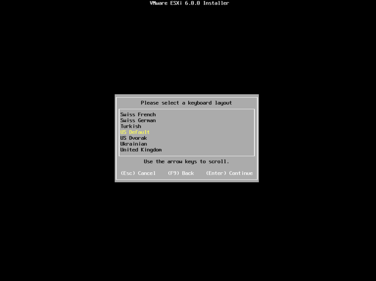 5、选择键盘布局,这里选择默认的“US Default”。按回车键继续。