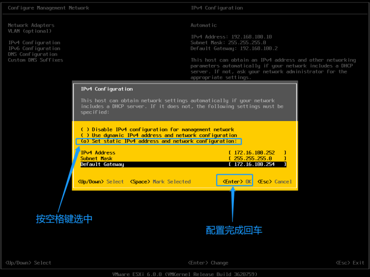 15、移动至第三项按空格键选中即可开始配置VMware ESXi的IP地址,配置完成后按回车键确认配置。如下图所示