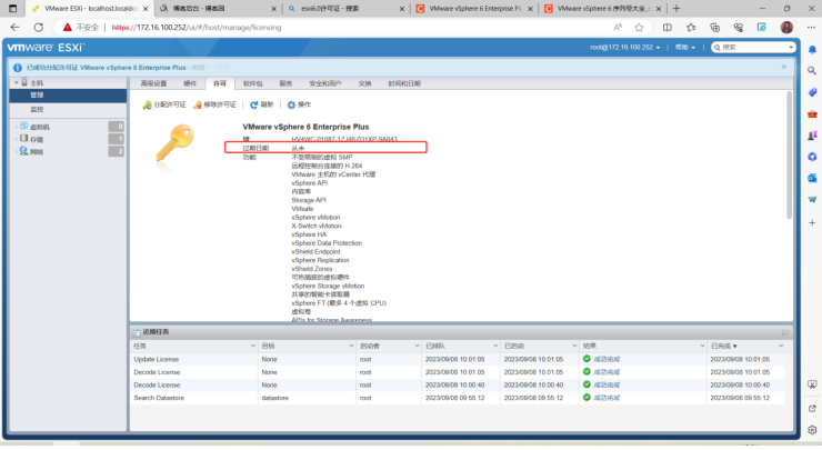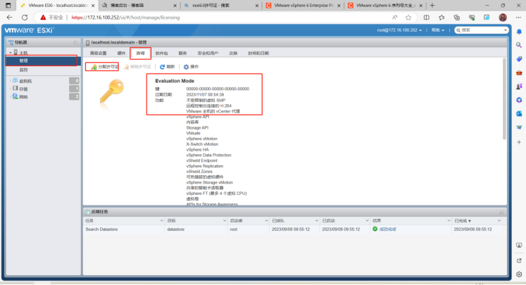 19、添加授权激活VMware ESXi,点击“管理”,点击“许可”,点击“分配许可证”,输入正确许可证ID激活。激活后过期日期显示“从未”,激活成功。如下图所示