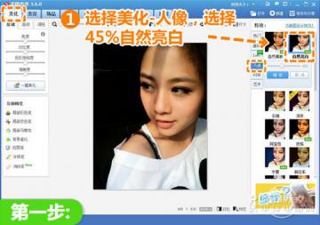1、启动“美图秀秀”先打开待处理的照片,进入“美化”菜单中点击“人像”分类,选择透明度为45%的“自然亮白”,点击“确定”先初步提高人物面部亮度。
