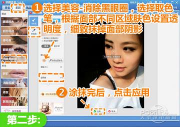 2、进入“美容”菜单下点击“消除黑眼圈”功能,选择“取色笔”选项,根据人物面部不同区域的肤色设置透明度,对人物面部上的阴影进行细致的涂抹。涂抹完毕后,点击应用。