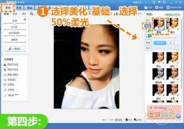 4、返回“美化”菜单下点击“基础”分类,选择透明度为50%的“柔光”特效,点击“确定”使人物皮肤更加柔和,富有立体感。