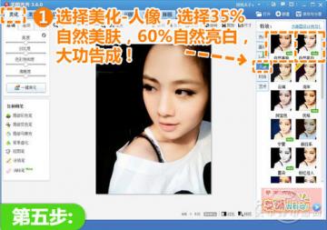 5、点击“人像”分类,选择透明度为35%的“自然美肤”和60%的“自然亮白”,整体提升人物面部的白皙程度,这样就大功告成啦!