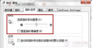 在控制面板中找到鼠标选项,然后切换到“指针选项”选项卡,这里只需要把鼠标的灵明度调到一个适中的位置就可以了,最重要是要把“提高指针精确度”这一项勾掉。