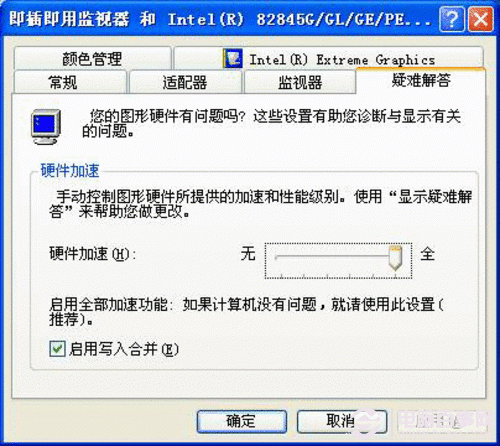 在桌面空白处右击选择属性调出显示设置框,在选项的高级按钮中找到“疑难解答”选项卡。在这里可以看到硬件加速的调节设置,一般情况下默认是全开的,但如果不想再被“鼠标飘”所困扰,那么就相应的调低硬件加速,基本上调到3档或4档,鼠标在玩游戏时就不会很飘了。