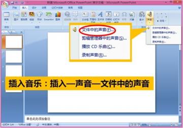 首先我们要选一首合适的音乐插入到我们的PPT中。建议大家根据自己的PPT风格来进行选择,不然会觉得很突兀哦~~在PPT操作栏点击“插入”,依次选择“声音”—“文件中的声音”,然后挑选一首恰当的音乐,点击确定就可以啦。