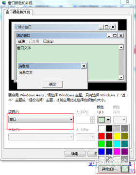4、在弹出的窗口颜色和外观中,将项目选为“窗口”颜色选为其他,进入到颜色选择。