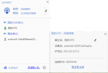 新加入的小伙伴,160WiFi会有接入提醒,加进来之后,点击用户名,可以看到他的详细信息,设备名、IP地址、连接时常,还可以自己设置备注名,如果不是自己的小伙伴,可以果断“踢进黑名单”,,他想蹭网的小心思就能扼杀在摇篮里了。