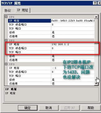 是修改“IPALL”中的“TCP端口”为1433.则问题解决。