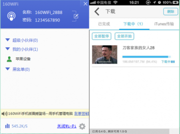 不久前推出的160WiFi3.0版本画面精简,操作简单,连接稳定。并且优化了开启速度和下载速度。小编现在用自己的手机连接160WiFi,在某视频网站上下载电视剧;以190多M的高清电视剧为例,16点16分开始下载,仅花费5,6分钟就下载了百分之94。一分钟后整个视频,就完整的下载到了小编的手机,经小编实测,这下载速度有着其他同类产品无可比拟的优势。