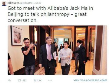 比尔·盖茨日前在Twitter上发布消息称已到达北京与阿里巴巴马云商讨慈善公益事宜,并称这是一次“伟大的会话”。
